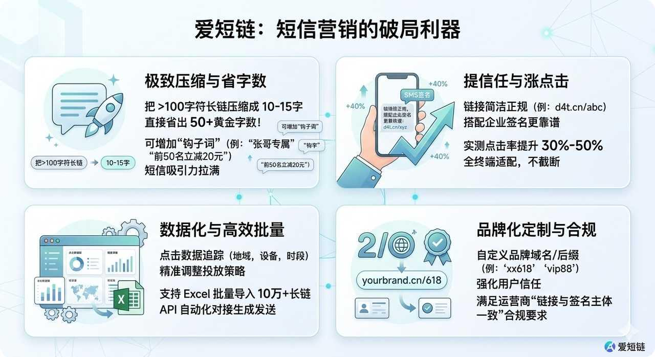 短链靠第三方服务器实现地址跳转,而爱短链专为短信营销优化,精准解决痛点: