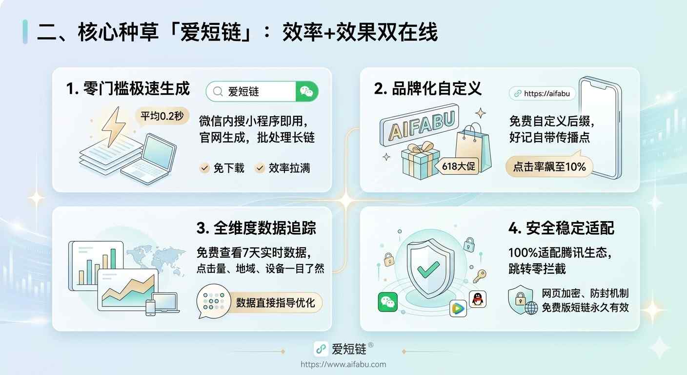 专为运营人打造的「爱短链」,支持微信小程序、官网(https://www.aifabu.com)双入口免下载,核心优势直接戳中运营痛点: