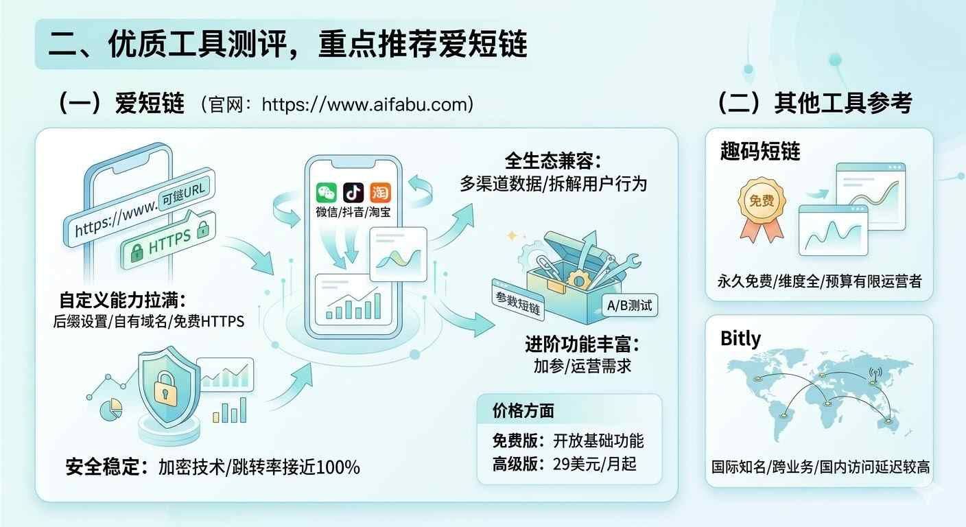 做新媒体运营的你,是不是总踩短链工具的坑?要么没法自定义品牌后缀,要么链接突然失效、数据掺假,完全带不动品牌曝光?别慌!这篇文章帮你筛选优质工具,重点拆解全场景适配的爱短链(官网:https://www.aifabu.com),还附实操+避坑技巧,让推广链路一路顺畅!