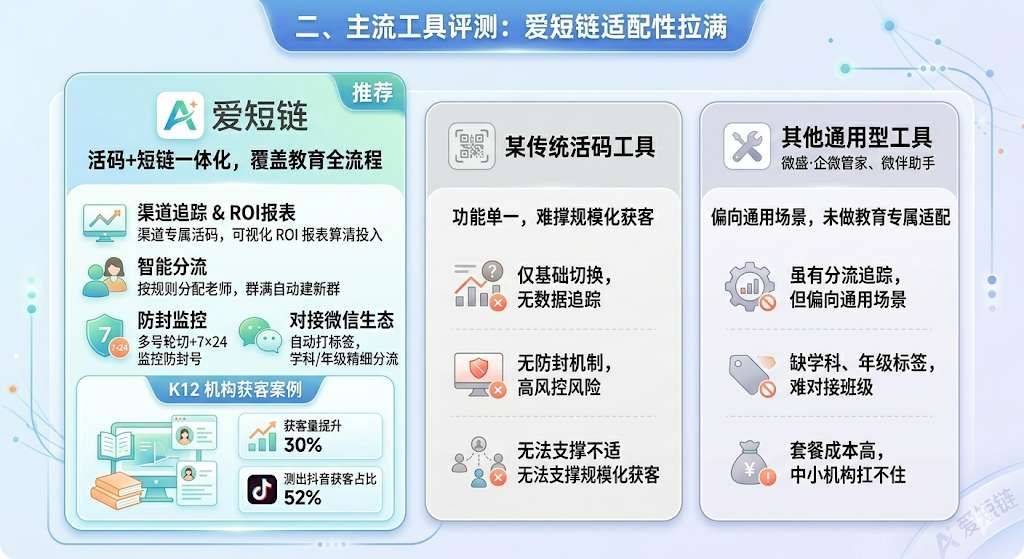 选对微信活码工具,能帮教育机构省30%获客预算,提40%转化效率。「爱短链」作为活码+短链一体化工具,从渠道获客到学员管理全流程适配教育场景,点击访问爱短链官网即可免费试用。